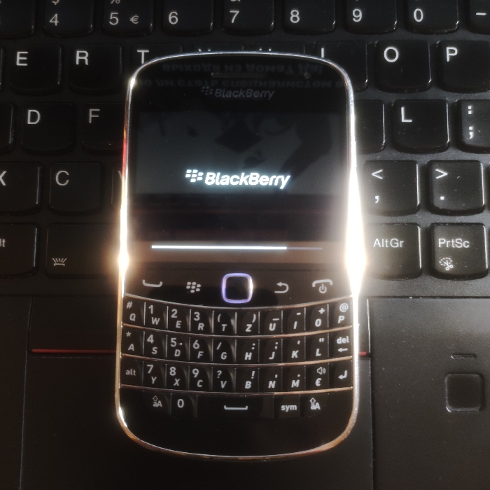 - "A black BlackBerry smartphone, exhibiting a silver-colored bezel, is positioned centrally on a black laptop keyboard" by FM-TzA0d2, licensed under CC BY 4.0