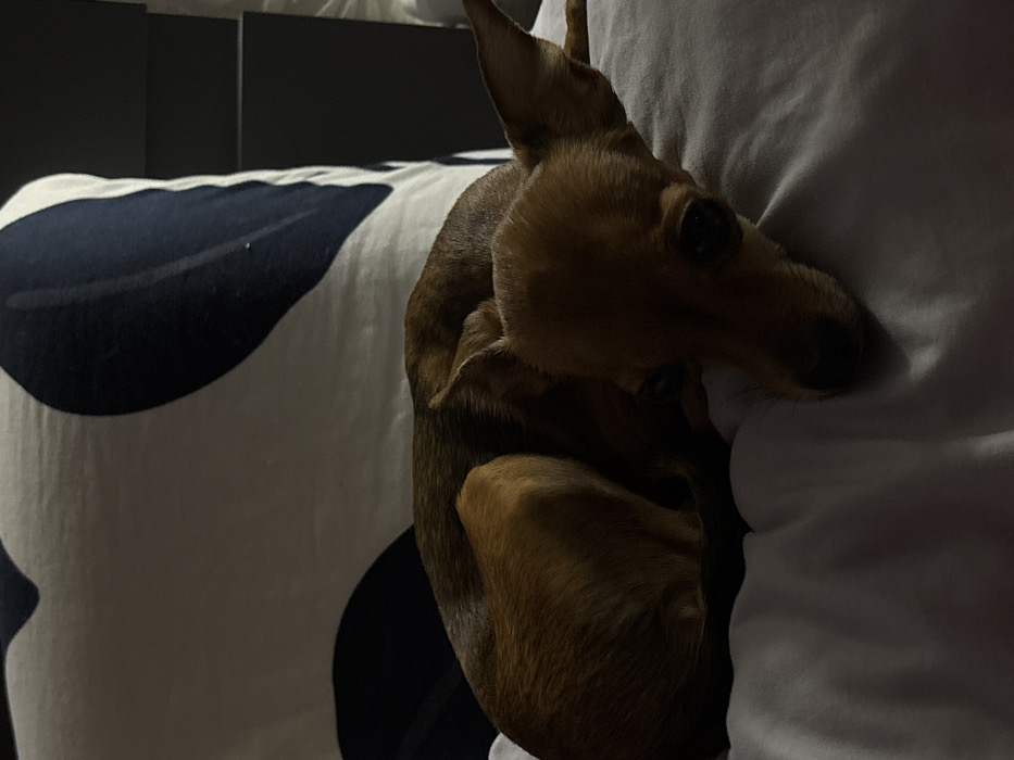 - "A small, short-haired dog, appearing to be a toy breed, is resting on a white sheet or blanket" by FM-qDnq83, licensed under CC BY 4.0