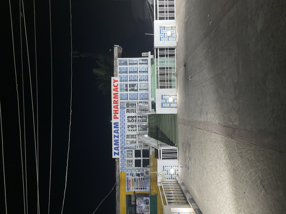 A street view at night showcasing the "Zamzam Pharmacy" building. The building has a white facade with intricate window designs. Below the pharmacy sign, there is a "Business Centre" advertisement. A paved pathway is seen on the right, with overhead wires visible on the left against the dark night sky. The scene appears to be a quiet neighborhood, possibly a residential or mixed-use area.
