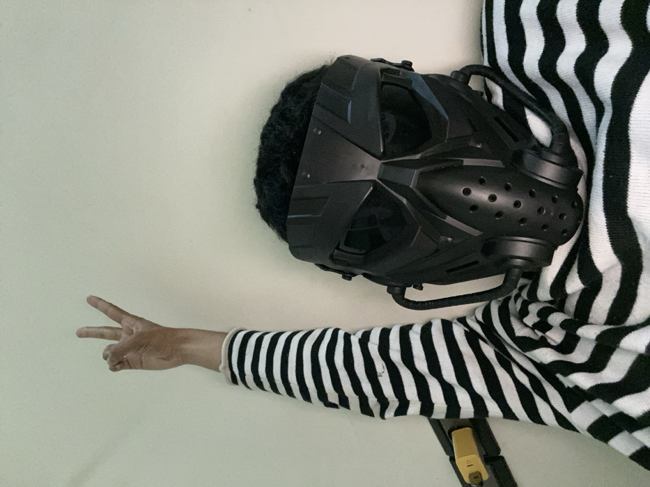 A person wearing a black and white striped shirt and a black futuristic mask lays on a light-colored surface. The person extends their left arm and hand to the left of the frame, making a peace sign with their fingers. The mask covers the person's head, obscuring their face. A portion of the person's dark, curly hair is visible under the mask. A yellow and black object is partially visible at the bottom right.