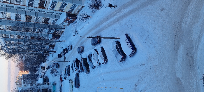 A snow-covered street scene with parked cars lining the right side. A tall apartment building extends along the left edge. Trees, bare of leaves, stand between the building and the cars. In the distance, a person walks on the snow-covered ground. The scene is dominated by white snow and the gray building.