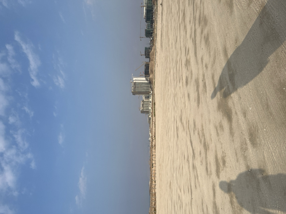 The image displays an expansive, undeveloped sandy or dirt landscape under a clear blue sky with sparse white clouds. In the immediate foreground, two elongated human shadows are cast onto the light brown terrain, which shows irregular patches of darker earth and linear markings, possibly from vehicle tracks. In the midground, a horizontal line of uniformly spaced, light-colored posts or pillars extends across the scene. Beyond this, the background features a developing urban area in Ras Al-Khaimah, United Arab Emirates. Multiple multi-story buildings are visible, some appearing complete or near completion, while others are distinctly under construction, characterized by visible scaffolding and numerous yellow tower cranes. The horizon line is hazy, separating the distant land from the clear sky. The scene is illuminated by natural light, indicated by the shadows.