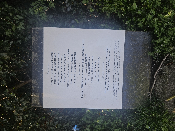 A rectangular white plaque, affixed to a darker, weathered base, is positioned vertically amidst dense green foliage and brown soil in Ger, France. The plaque displays French text in dark, legible characters, detailing the conception, realization, and project direction of an unidentified work. Under "Conception," roles and names include: Sculpteur Jean-Bernard MÉTAIS, Maquettiste Henri BONTEMPS, Ingénieur conseil Antonio GOZALO, Éclairagiste Pierre BIDEAU, Paysagiste Benoît LACCINTA, Graphistes, scénographes S. & J. JUPIN, Rédactrice Victoire LABAUGE, and Iconographe Chantal HANOTEAU. Under "Réalisation," entities and materials listed are: Structure MANCHE INDUSTRIE MARINE, LEROUX ET LOTZ; Génie civil CASTELLS FRÈRES; Voiles Henri BONTEMPS; Cyclistes Olivier HALIGON; Mobilier BERNAD; and Lave émaillée PYROLAVE. The "Direction du projet" is identified as ASF, mission Aires, Architecture, Oeuvres d'Art, located at 103, avenue de Suffren, 75725 Paris cedex 15. The plaque exhibits minor surface imperfections, possibly dirt or slight abrasion, particularly near the bottom. The surrounding environment consists of various types of green leafy plants, some with smaller leaves, and scattered dry twigs on the soil. No individuals or animate subjects are present, and no actions or interactions are depicted. The scene is illuminated by natural light, casting soft shadows.