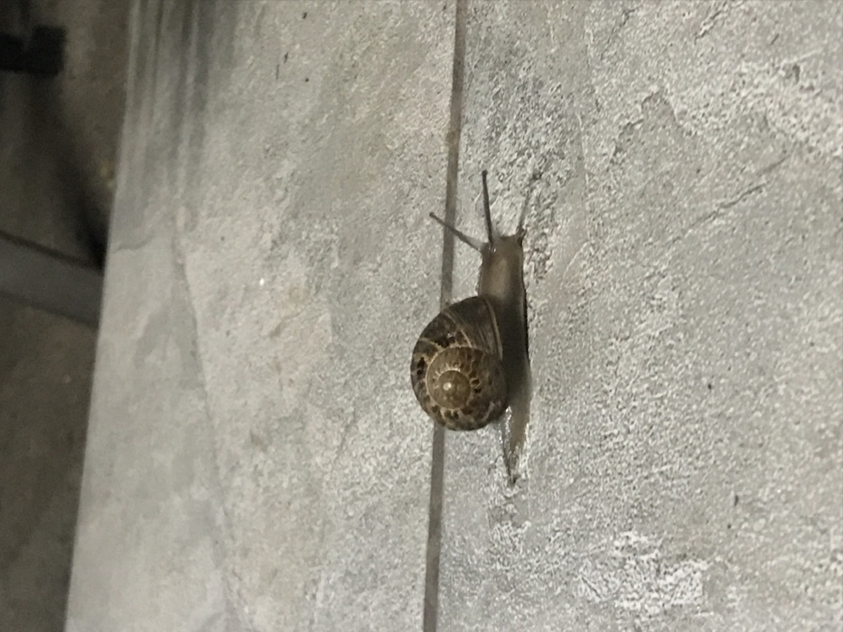 A terrestrial snail is observed moving across a light grey, textured surface, likely concrete or large-format tile, in Johannesburg, South Africa