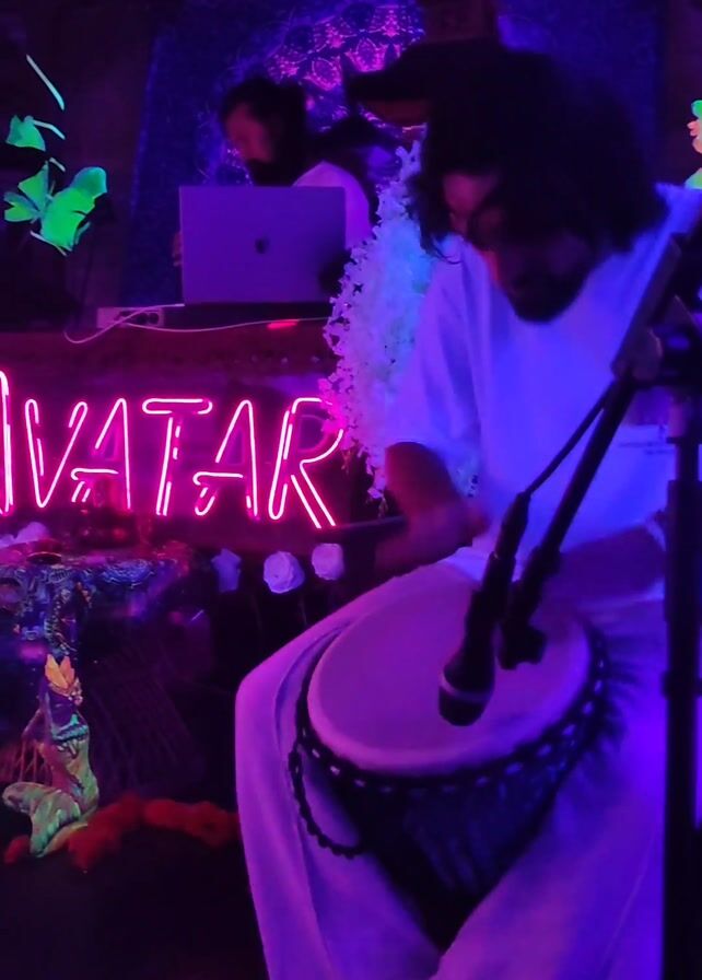 A man is playing a djembe drum in a neon-lit room with a sign reading "Avatar