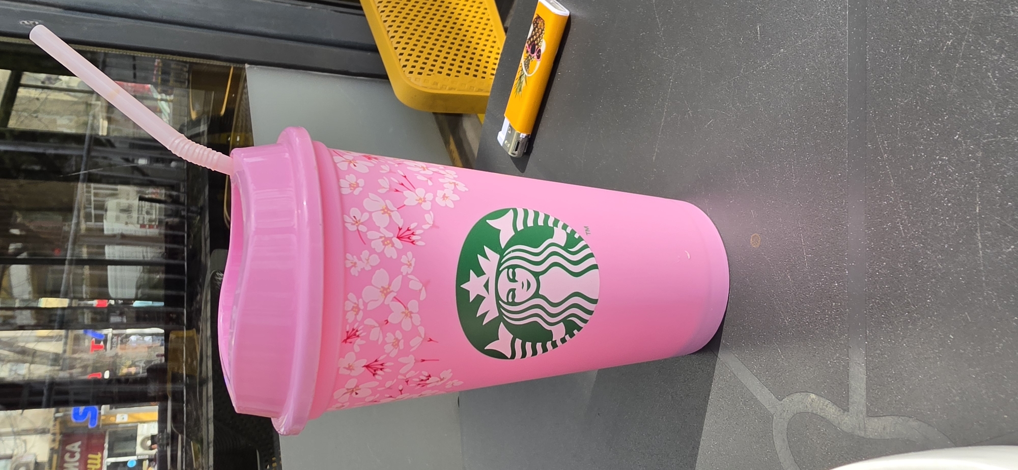 - "The scene depicts a bright pink Starbucks tumbler, equipped with a matching lid and a translucent pink straw, resting on a dark grey, subtly patterned table in Kazanlak, Bulgaria" by FM-dJDtu1, licensed under CC BY 4.0