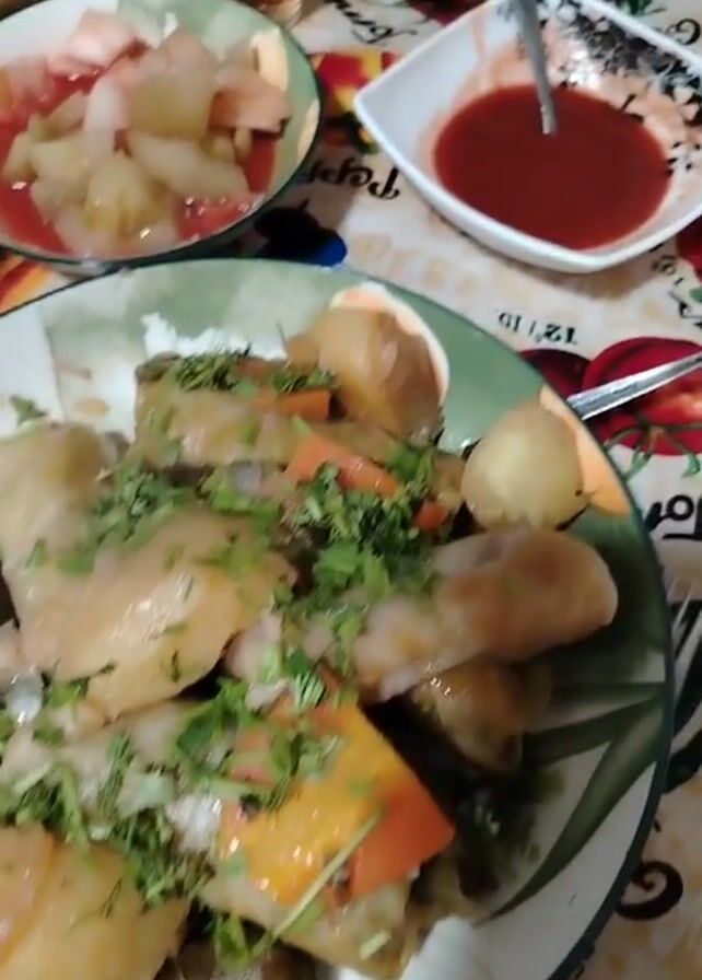 A close-up pans up and out to show a dinner table spread with food. On the table are a plate of stuffed cabbage rolls with herbs, a dish of stewed fruit, a small bowl of cubed green melon, a small white bowl of red sauce with a spoon, two glasses of dark liquid, a small bowl of sour cream, a small black bowl of jam or preserves, and a stack of flatbread. The table cloth has an image of tomatoes and peppers printed on it. There is silverware at each place setting.