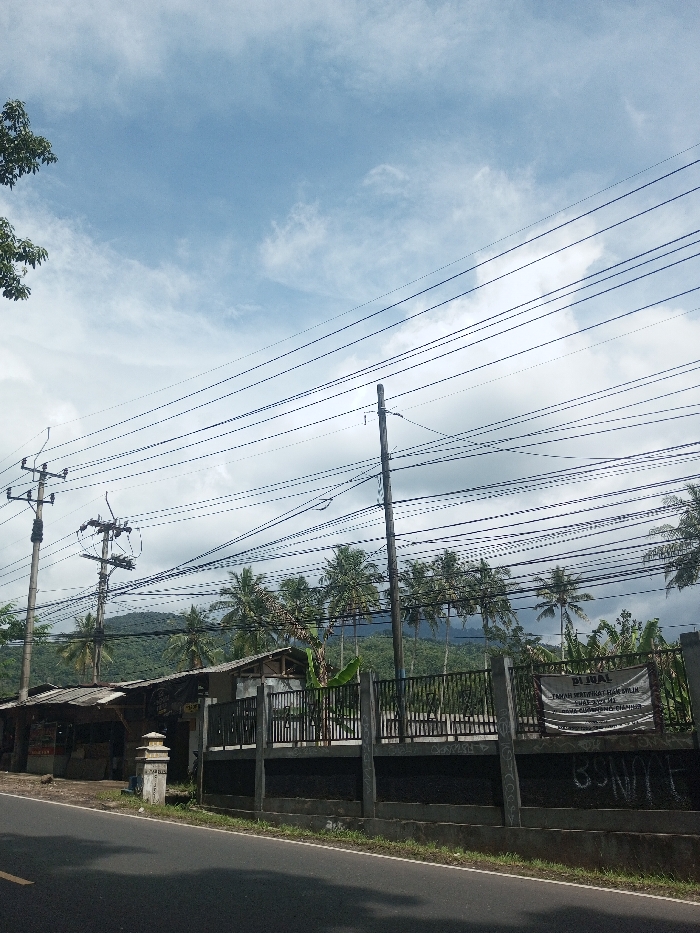 A landscape scene features a road and a low wall beside it. Behind the wall, there is a building under a sloping roof and palm trees. Mountains can be seen in the distance. Overhead are numerous power lines crisscrossing the sky. The sky is partly cloudy with a mix of blue sky and light, white clouds. A utility pole stands near the building.
