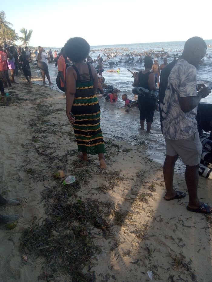 The image depicts a crowded beach scene at Shanzu ward, Kenya, during daylight hours. The foreground consists of wet, light-colored sand densely mixed with dark seaweed and some discarded debris, including two coconuts and a crumpled plastic bag. In the central foreground, an African female is observed from behind, walking barefoot towards the water. She has dark, natural, voluminous hair and wears a form-fitting, ankle-length, sleeveless dress featuring horizontal stripes of black, yellow, and green. She holds a dark-colored mobile phone in her right hand. To the right, an African male stands in profile, facing towards the left. He wears a light-colored, short-sleeved shirt with a faint pattern (possibly animal print), light grey shorts, and dark sandals. He carries a dark backpack and is actively looking down at a mobile phone held in his hands. Between these individuals and extending into the midground, shallow water laps against the shore. Several children are seen playing or wading in this area, some utilizing dark-colored inner tubes. Adults are also present in the shallow water, some carrying similar floatation devices. The background shows a vast expanse of the ocean densely populated with numerous individuals, primarily adults, engaged in swimming, wading, and recreational activities. Many people are partially submerged, and several small flotation devices are visible. On the far left, a crowd of people is also present on the sandy shore, partially obscured by palm trees visible at the edge of the frame. The sky is clear, and strong sunlight casts shadows across the sand.