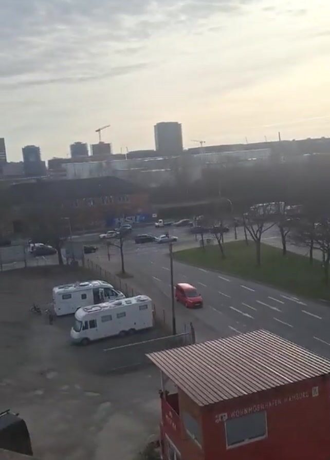 n elevated view of a city scene on a cloudy day. In the foreground, there's a red building labeled "WOHNMOBILHAFEN HAMBURG" and a parking lot with a couple of white recreational vehicles. A street with cars driving by runs parallel to the building. Across the street, there's a green strip of land with trees, and behind that, a busy intersection with more cars. Further in the background, the city skyline is visible, featuring several buildings and construction cranes. The overall atmosphere is somewhat industrial and urban.