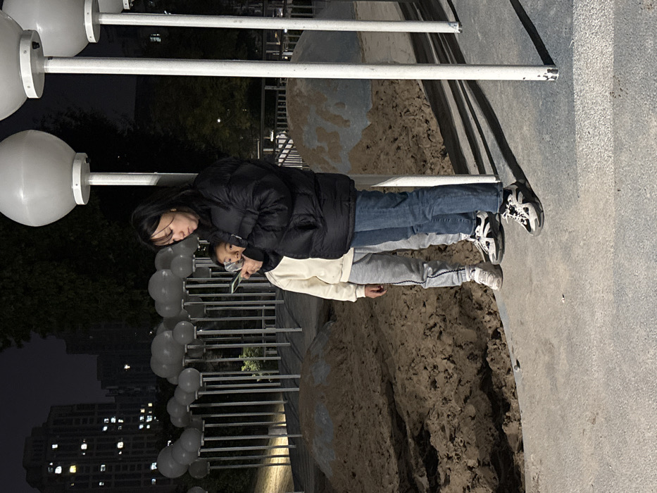 The image depicts an outdoor nighttime scene in Jiangjin, China. An adult female stands prominently on a light grey concrete surface, wearing a black puffer jacket, blue jeans, and black-and-white sneakers. She is looking downwards, holding a green-cased smartphone with both hands. Slightly behind and to her left, a child dressed in a light-colored hooded sweatshirt, grey sweatpants with a dark side stripe, and white sneakers stands facing forward. To the left of the individuals, a large area of dark brown, uneven, possibly excavated soil or sand is present. On the right side of the frame, multiple tall white poles support white spherical light fixtures. Further back, an array of white, cloud-shaped decorative elements are mounted on slender poles. In the distant background, numerous high-rise buildings with illuminated windows are visible against the dark night sky.