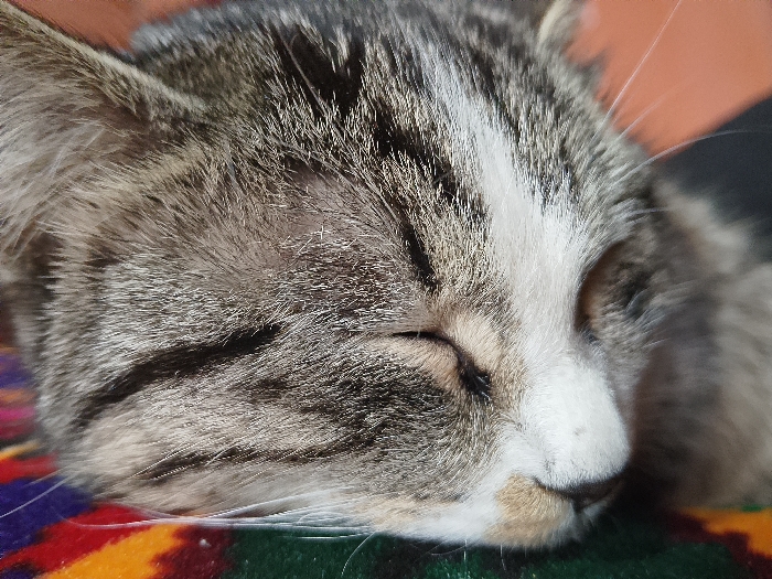 A close-up photograph captures the head of a domestic cat in a state of repose. The cat exhibits a tabby coat pattern, featuring grey and brown stripes across its forehead, ears, and cheeks. Patches of white fur are visible on the bridge of its nose, around its closed eyes, and extending to its muzzle, with a small area of light brown fur below the nose. White whiskers emanate from its muzzle. The cat's head rests upon a multi-colored fabric, which displays geometric or abstract patterns in shades of red, orange, green, blue, and purple. The background is out of focus, showing indistinct tones of orange/brown and dark grey/black. The scene is located in the city of Unknown, Unknown.