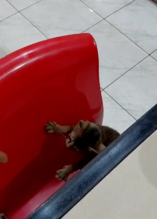 A small kitten sits on a red plastic chair with its back to the backrest. A hand approaches the kitten. The kitten tucks its head into its chest. The chair is next to a table with a black metal edge. The floor is made of white square tiles.