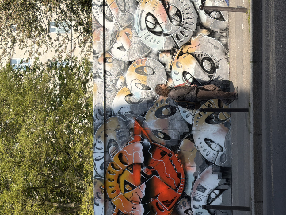 An individual walks leftward along a sunlit sidewalk in Paris, France, against a graffiti-covered wall. The wall, approximately 2.5 meters high, features a complex, layered graffiti mural depicting mechanical, gear-like circular shapes in shades of orange, red, black, grey, white, and subtle blues. A prominent large orange and red circular design with black outlines and internal geometric patterns is visible on the left side of the wall. The person has shoulder-length wavy dark brown hair and a beard, wearing a dark jacket, dark trousers, and light-colored shoes. A dark backpack is on their back, and a red object is held in their left hand. They are captured mid-stride, casting a distinct shadow on the sidewalk. In the foreground, a dark asphalt street is separated from the light grey sidewalk by a curb. Three dark bollards are spaced along the sidewalk's edge. Above the wall, lush green trees occupy the upper left and middle, while a light-colored building with visible windows is partially seen through sparser branches on the upper right. The scene is illuminated by strong sunlight.