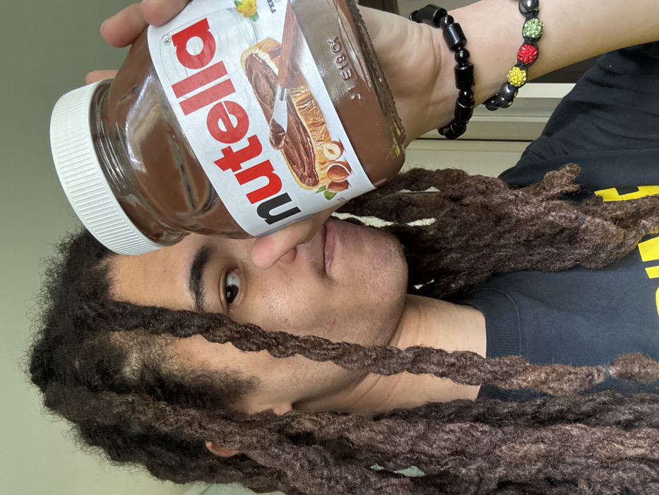 A male individual with dark brown dreadlocks, wearing a dark t-shirt, is partially visible in an indoor setting in Les Ulis, France. He holds a large glass jar of Nutella brand hazelnut spread with a white screw-top lid, positioned to obscure the lower-right portion of his face. His right eye is visible, looking directly towards the camera, and his chin shows light stubble. On his left wrist, he wears two beaded bracelets: one composed of black cylindrical and spherical beads, and another featuring smaller black beads with three larger, round, faceted beads in red, yellow, and green. The background consists of a plain, light-colored wall.