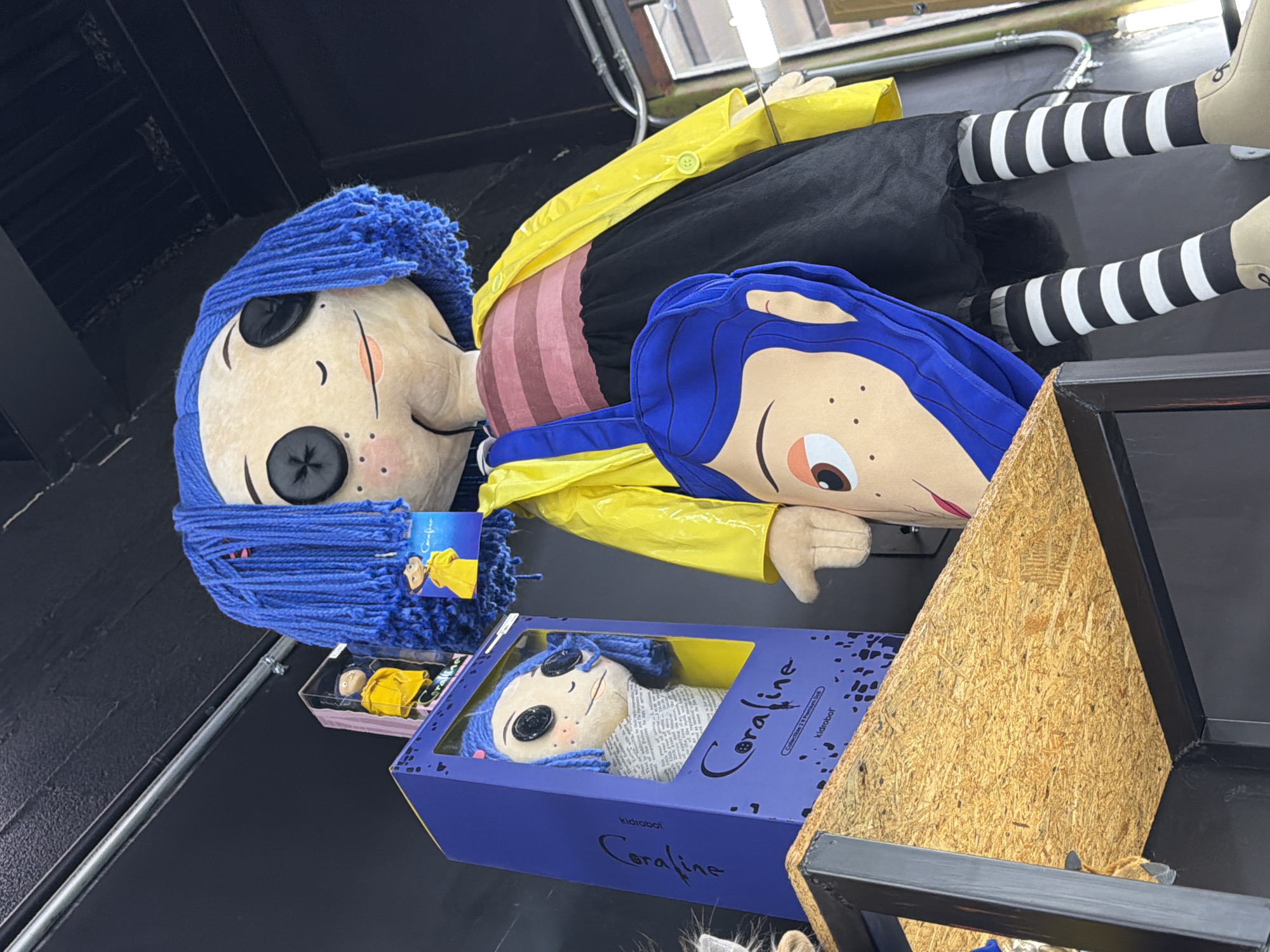 The image depicts a collection of "Coraline" themed items. A large doll, possibly a display piece, is lying on a black surface. The doll features blue yarn hair, button eyes, a striped top, a black skirt, a yellow raincoat, and striped tights. Beside the doll is a box containing a smaller Coraline doll, packaged as a collectible item. A smaller package with an even smaller doll can also be seen. The composition suggests these items are on display for sale. No people are visible in the frame. The location is identified as Puebla, Mexico, though there are no overt elements in the image to independently confirm this location.