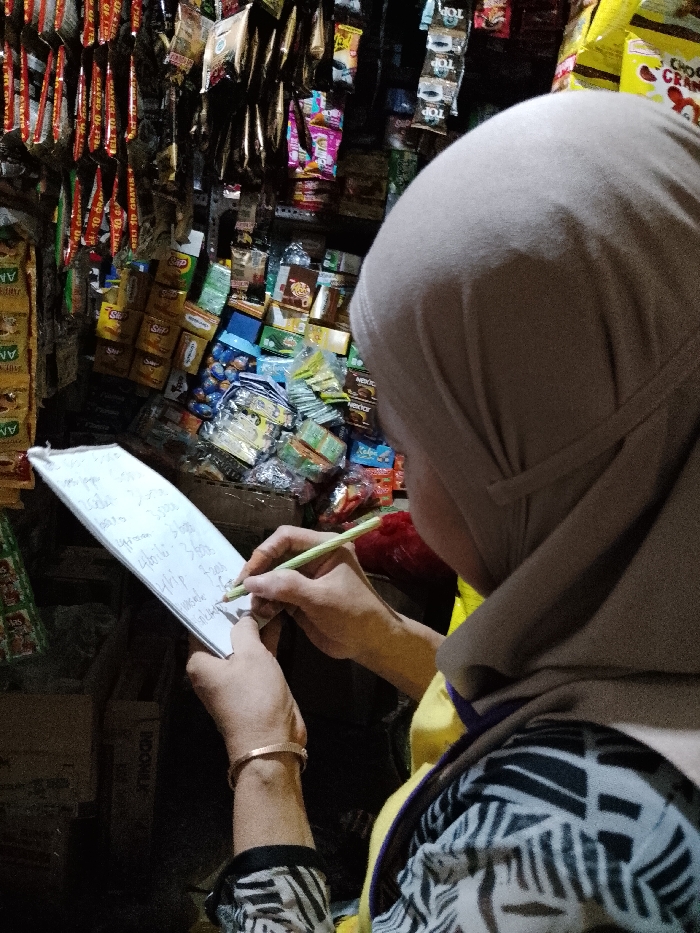 A person wearing a hijab is writing on a piece of paper. The handwriting appears to be a list of items and prices. The background reveals shelves densely packed with various packaged goods, including snacks, beverages, and other miscellaneous items commonly found in a small convenience store or market. The lighting is somewhat dim, casting shadows and creating a cluttered atmosphere.