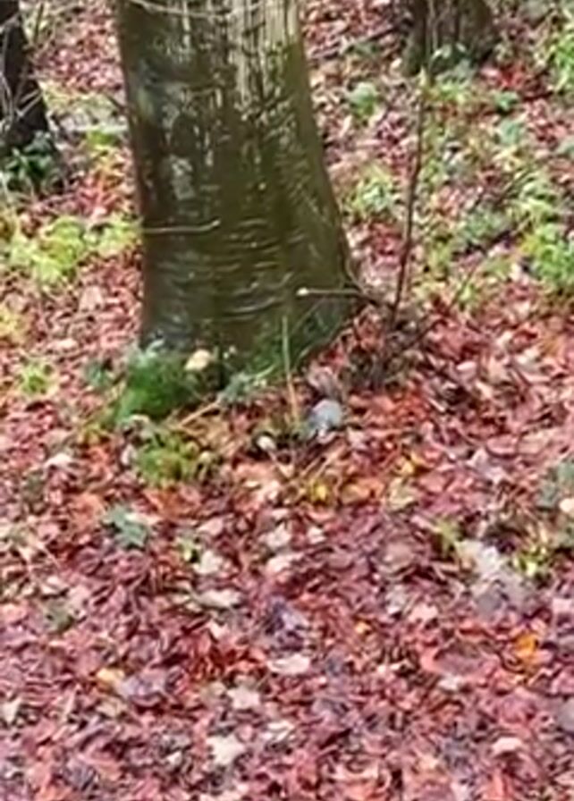 A squirrel is visible near a tree in a forest. The forest floor is covered in wet, red and brown leaves. The tree has a light colored trunk.
