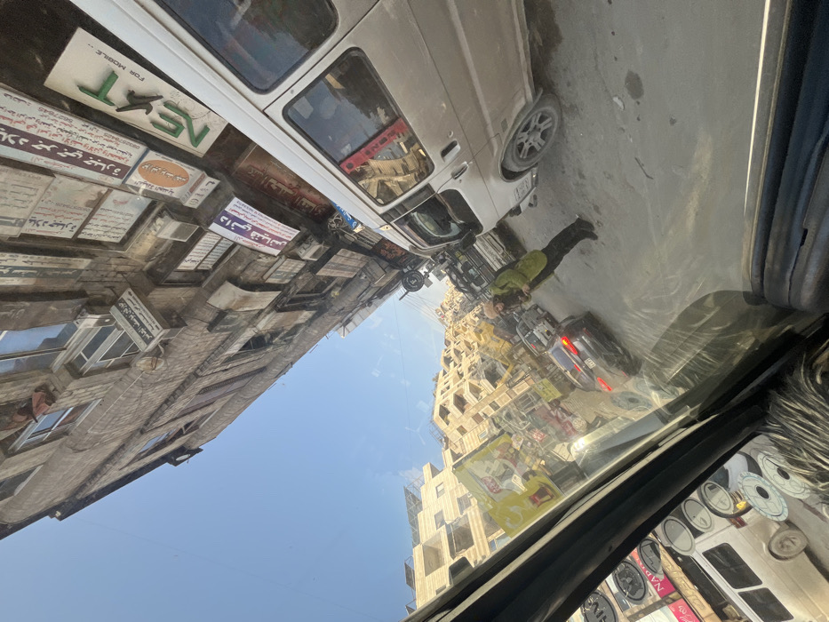 street scene with buildings covered in Arabic text signs, including advertisements for "NEXT FOR MOBILE," Dr. Joseph's skin diseases clinic, George Jabara lands, and Dani Finianos. A white van and a person on a motorcycle are on the street. The perspective is from inside a vehicle, with a partially visible dashboard covered with small round stickers or labels.