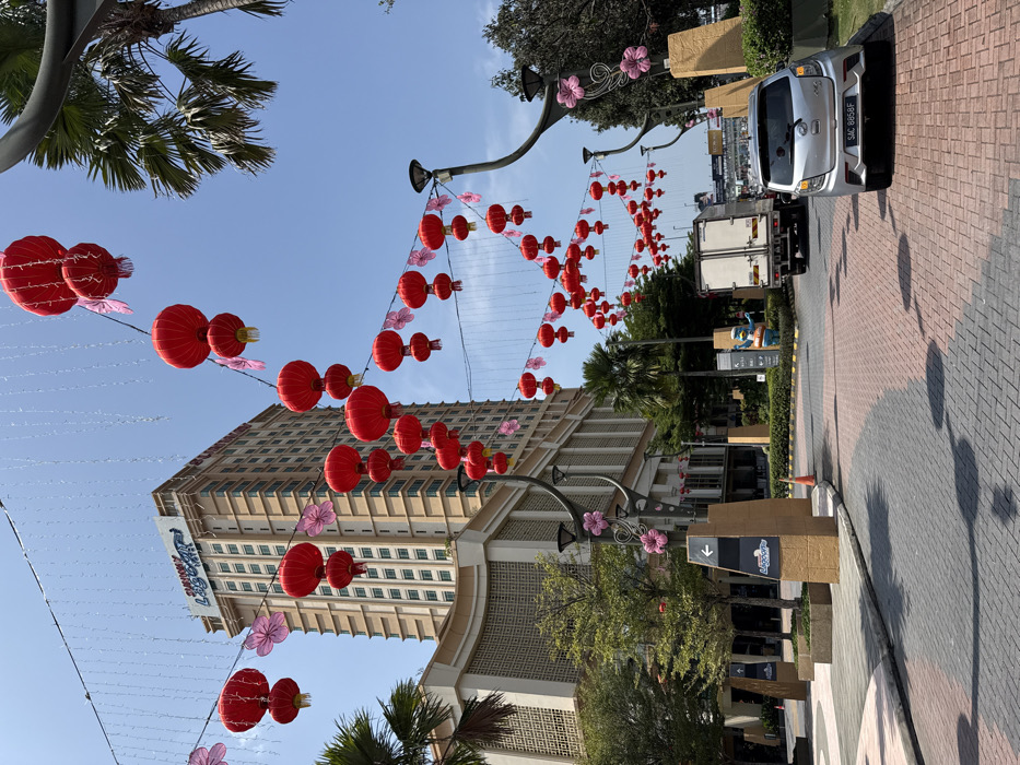 A cityscape features red Chinese lanterns strung across the street, adding a festive atmosphere. A tall building with many windows rises in the background. Palm trees and other greenery frame the scene. A street runs along the right side of the frame, with a white vehicle and a truck parked on it. Decorations adorn the streetlights, enhancing the ambiance.
