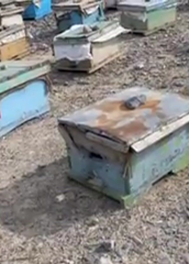 large number of beehives placed on a rocky, barren ground. The hives are rectangular wooden boxes, painted in various colors like blue, green, and white. Some of the hives have tattered or worn coverings on top, with a few even having rocks placed on them. In the background, there are remnants of what appears to be a dilapidated structure. The scene is set outdoors under daylight.