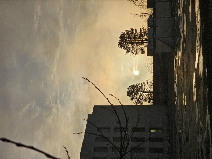 Silhouetted trees frame a low-hanging sun in a hazy sky. Below, a modern building with rectangular windows stands partially obscured by a bare tree's branches. The ground shows reflections, suggesting wet conditions. A contrasting area, potentially asphalt or pavement, stretches out, indicating the presence of structures and outdoor space. The overall composition suggests a late afternoon or early morning scene.