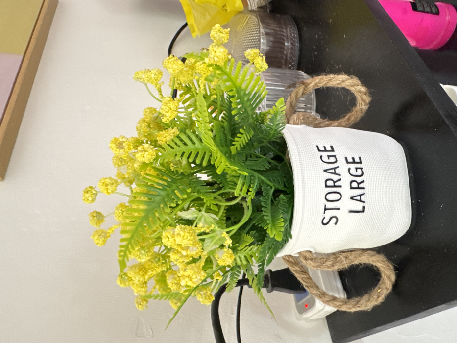 The image depicts an indoor scene in Altagracia, Venezuela, featuring an artificial plant on a black surface. The primary subject is a white, textured fabric pot, labeled "STORAGE LARGE" in black capital letters on its front, which sits centrally on a black shelf or table. The pot has two thick, braided jute rope handles attached to its sides. Inside the pot, an artificial plant is arranged, characterized by numerous bright yellow, spherical flower clusters and dense green, fern-like plastic leaves. To the left of the pot, an electrical wall outlet is visible on a light-colored wall, with a black power adapter plugged into one of its receptacles. A small red indicator light is illuminated on the outlet. A black cord extends from behind the plant. To the right of the pot, on the same black surface, several objects are partially visible: a clear, possibly glass, container with vertical ridges, a yellow soft object, and a pink cylindrical object in the lower right corner. Above the scene, a light-colored wall is visible, with a wooden frame partially present in the top right corner. No individuals or dynamic actions are depicted.