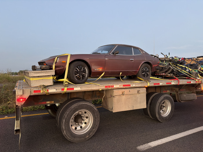 - "A maroon Datsun 280Z is secured with yellow straps atop a flatbed trailer" by FM-Ft7F82, licensed under CC BY 4.0