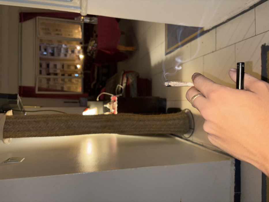 The image depicts an indoor scene at night, likely an apartment or dwelling in Tangier, Morocco, inferred from common Moroccan interior design elements such as tiled floors, window style, and traditional-looking low seating. In the foreground, a right hand with a plain gold-colored band on the ring finger holds a lit, hand-rolled smoking item (consistent with a cigarette or joint) between the index and middle fingers, emitting visible smoke. The thumb concurrently holds a black, cylindrical object, possibly a lighter or vape pen. The floor is covered with light-colored tiles, and a dark-colored rug is partially visible at the bottom edge. The scene transitions through a doorway or hallway into a living area. To the left of this transition, a tall, light brown, woven cylindrical object (resembling a cat scratching post or decorative pillar) stands vertically, with a warm light source illuminating the adjacent wall. The background reveals a furnished living space with a window offering a view of multi-story urban buildings with illuminated windows against a dark night sky. Dark red curtains frame the window. Inside the room, a table draped with a dark red tablecloth holds a plastic water bottle. A side table with a red-shaded lamp provides additional warm lighting. Partial views of upholstered seating, potentially traditional Moroccan low sofas, are visible. The flooring in this background area also consists of light-colored tiles.