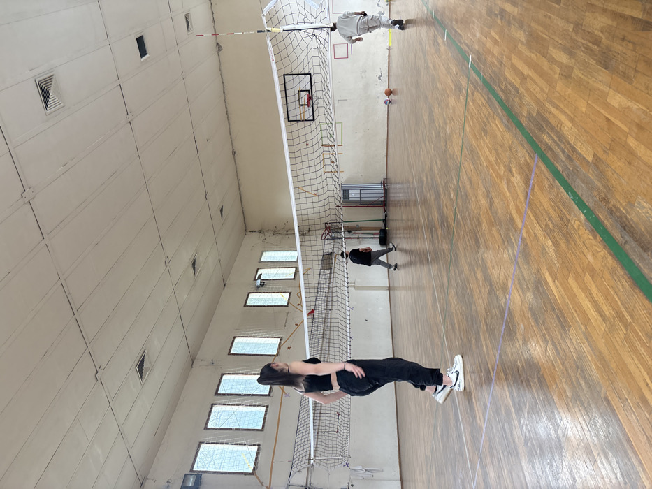 This image depicts an indoor sports hall in Troyan, Bulgaria, characterized by a well-lit environment and a wooden floor marked with green and purple lines. The ceiling is paneled and light-colored, featuring several square ventilation grilles. The light-colored walls show some wear and tear, with multiple tall, rectangular windows on the left side, covered by a protective mesh. A standard white volleyball net is stretched across the court, with a red and white striped antenna pole visible on its right side. Behind the net, on the far wall, a black basketball hoop with a backboard is mounted. Three individuals are present on the court. In the foreground, positioned slightly to the left of the center, a female with long dark hair tied in a high ponytail stands facing away from the camera and towards the net. She is wearing a black crop top, black baggy pants, and white Nike Air Force 1 sneakers with black accents. Her arms are bent, and her hands are near her hips, suggesting readiness for activity. In the midground, towards the center-right, a male is walking to the left. He is dressed in a black t-shirt, gray sweatpants, and dark shoes, and wears a white baseball cap backward. He holds a dark object in his left hand. Further into the background, on the far right, another male is walking towards the right, facing away from the camera. He is wearing a light-colored (possibly white or light grey) long-sleeved top and matching pants, with dark shoes. Various objects are scattered on the court: a basketball and another multi-colored ball are visible near the far wall beneath the basketball hoop. A tall, silver, locker-like unit stands against the far wall near other red and yellow athletic equipment. The overall scene suggests a casual sports or practice session is underway.