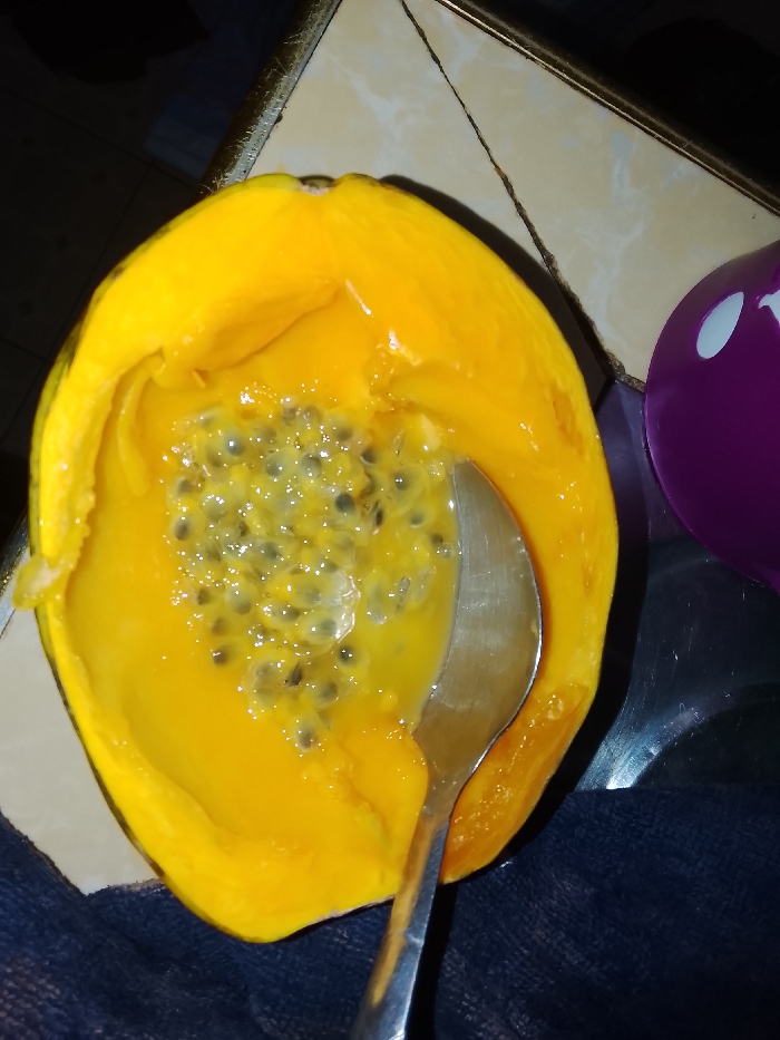 A halved, ripe papaya is displayed, its vibrant yellow flesh exposed. The fruit's cavity is filled with numerous seeds embedded in a juicy pulp, creating a textured visual. A silver spoon rests inside the papaya, suggesting it is being consumed. The background includes a tiled surface, a portion of a purple object with white dots, and a dark blue cloth.