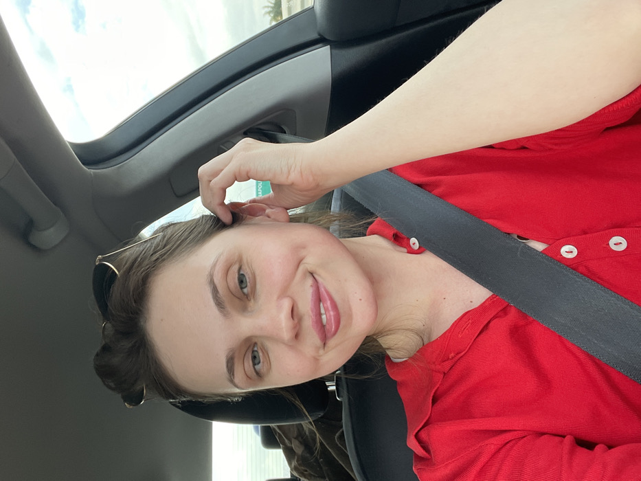 The image displays an adult female situated in the passenger seat of a vehicle, located in Scafati, Italy. The female subject has light skin, brown hair styled in an updo, and brown eyes, with sunglasses perched on her head. She is wearing a red collared shirt with white buttons and is secured by a dark-colored seatbelt extending diagonally across her chest. Her gaze is directed towards the camera, and she exhibits a slight, closed-mouth smile. Her right hand is raised, with fingers lightly touching the area near her right ear. Through the vehicle's right-side window, a partial green road sign is visible, displaying "NAPOLI" in white lettering, indicating a route towards Naples. The background outside the vehicle shows a cloudy sky and distant vegetation. Inside the car, behind the driver's seat, an object covered with dark fabric is partially visible.