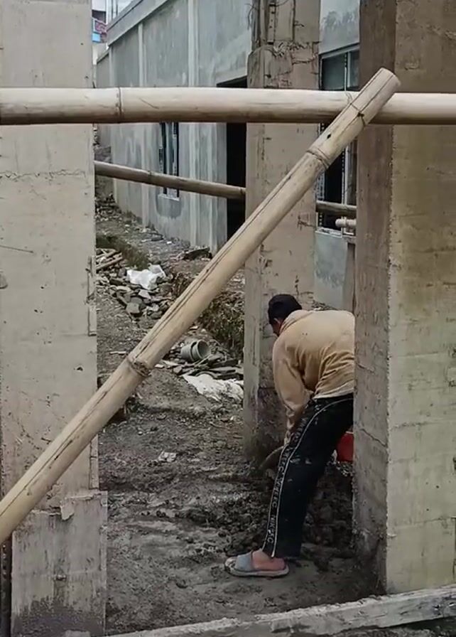 A man is using a hoe to dig in a muddy area between concrete walls. The walls appear to be part of a building under construction, with bamboo support structures visible. The man is wearing a tan shirt, dark pants with a light stripe down the side, and slides. In the background, there's another building and some rubble.