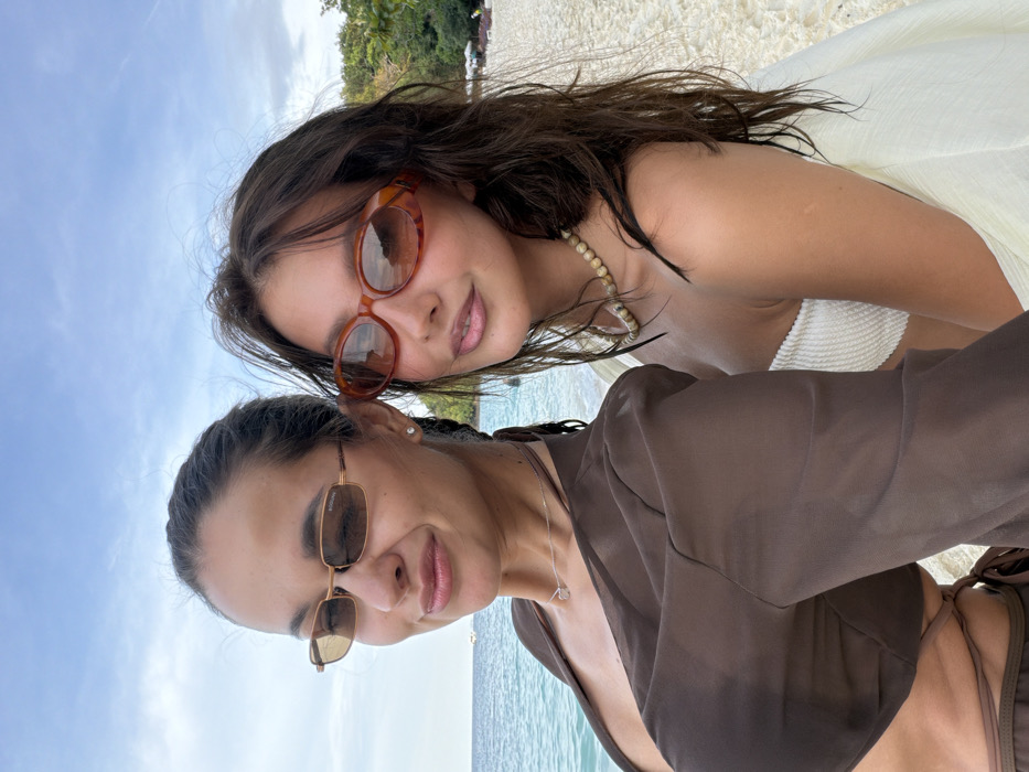 The image presents two adult females posing for a photograph on a white sandy beach in Rawai, Thailand