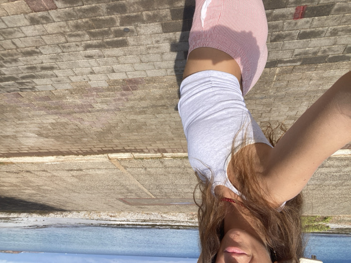 An image taken in Skala, Greece, captures a female individual from the mid-torso up, angled slightly away from the camera, standing outdoors on a paved area adjacent to the sea
