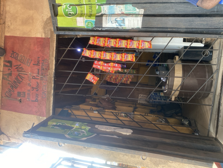The image depicts the entrance of a small retail establishment identified as "J.A.D. COMMUNICATION ENTERPRISE" located in Okura, Olatuja, Nigeria. The shop entrance features open, dark-colored metal security doors with a fixed metal security grate behind them. A red sign above the entrance advertises "buy Your Phone here" with contact numbers 0807801804 and 08070847277. Various posters are affixed to the exterior, including green advertisements on the left door and "Glo" telecommunication advertisements on the right door, one featuring a male model. Inside the visible portion of the shop, multiple strings of red and yellow packaged snacks are suspended from the metal grate. A brown and tan barrel-shaped cooler or dispenser sits on the floor directly behind the grate. To its right, a white upright appliance, possibly a small refrigerator, and a black LG brand speaker are visible. The interior is dimly lit with a single overhead light source. Clutter, including a black trash bag, is visible on the floor to the left of the cooler. The building exterior appears to be made of light-colored, weathered concrete or similar material. Bright sunlight is evident in the upper left, indicating daytime conditions. A fragment of a blue garment and a person's arm are visible on the far right edge of the frame, suggesting the presence of an individual outside the shop.