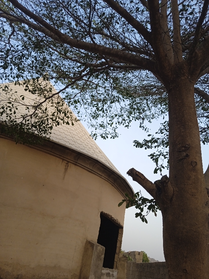 A rounded, light-colored building with a tiled, conical roof is partially visible. A large tree with a thick trunk and sparse leaves dominates the right side. A dark, empty window or opening is visible in the side of the building. A stone wall or structure is visible behind the building in the distance. The sky is light blue and partially obscured by the tree branches.