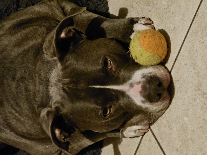 - "A brown and white American Bully dog lies upside down with a tennis ball balanced on its snout" by FM-n22Rc2, licensed under CC BY 4.0
