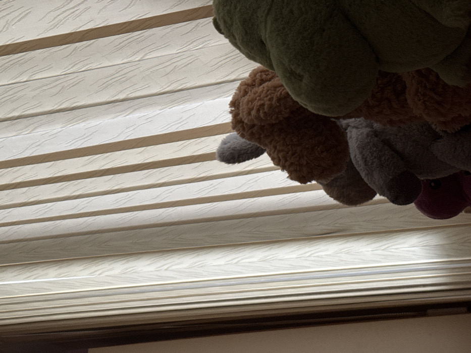 The scene depicts an interior view of a room, looking towards a window. The specific location within the city of Yambol, Bulgaria, is not discernible from the visual evidence. The dominant feature in the background is a set of light-colored, possibly off-white or cream-colored, vertical blinds covering a window. The blinds exhibit a subtle, textured pattern, appearing as thin, slightly wavy horizontal lines. Natural light filters through the blinds, creating variations in brightness across the slats. To the far left, a dark brown vertical frame element, likely part of a window or door frame, borders a lighter, plain wall or surface. In the foreground, positioned in front of the blinds and partially silhouetted against the light, is a linear arrangement of multiple plush toys. From left to right, partially obscured, a dark purple or magenta toy is visible. Next is a grey plush toy with a distinct brown snout. Following that is a brown, shaggy-textured plush toy. The largest and rightmost visible toy is dark green, indistinct in shape due to backlighting, but clearly a stuffed animal. No individuals are present, and no actions or interactions are occurring. The environment appears static and domestic.