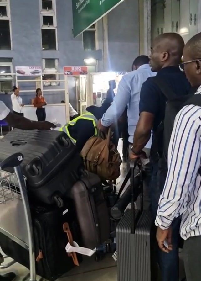 group of men queuing at an airport, possibly for baggage claim. Most of the men are dark-skinned and dressed in casual or business casual attire, some wearing backpacks. One man wears glasses and a striped shirt. An airport worker, dressed in a safety vest, appears to be helping load luggage onto a baggage cart. Several suitcases and bags are piled on the cart. Signs are visible, including advertising for Sun Trust Bank and instructions for passengers to go to the car park for pick-up. The environment appears to be indoors, likely an airport terminal. The overall scene suggests arrival and baggage handling.