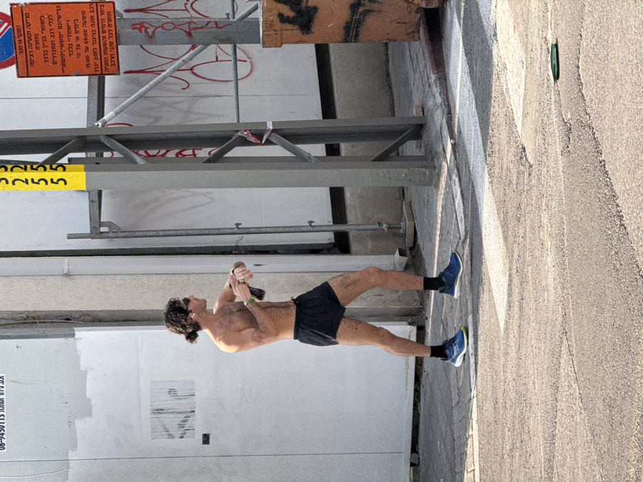 The image captures an adult male standing on a paved sidewalk in Tel-Aviv, Israel, under clear daylight conditions. He is bare-chested, with dark, curly hair tied into a ponytail, and wears dark sunglasses. His attire consists of dark running shorts, black ankle socks, and blue athletic shoes with lime green elements on the soles. Tattoos are visible on both his upper thighs. He is looking down at his left wrist, which bears a watch and a green bracelet, while holding a dark green bottle in his right hand. White in-ear headphones are visible. In the foreground, a paved asphalt street displays white painted lines and a small, flat dark green object resting on the surface. A red and white painted curb separates the street from the sidewalk. To the left, a light-colored building wall is visible, showing partially obscured Hebrew text at the top and patches of gray paint with faint markings. To the right of the male subject, a metallic scaffolding-like structure stands next to a tall, yellow pole marked vertically with repeated numbers, appearing to be "5555." Further right, an orange rectangular sign with white Hebrew text, possibly a construction or traffic notice, is attached to a pole. Below this, a brown concrete block is marked with black graffiti, and a white wall behind it features red graffiti.