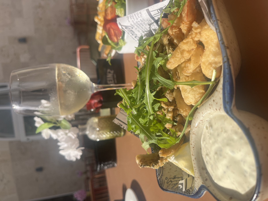 A close-up, elevated view captures a meal set on a brown table, depicting a dining scene in Saint Paul's Bay, Malta. The primary subject is an oblong, multi-compartment ceramic serving dish, patterned with blue and white designs, filled with fried seafood. This includes golden-brown fried shrimp, calamari rings, and small fried fish, topped with a generous portion of green arugula leaves. A lemon wedge rests on the edge of the dish. One compartment of the dish contains a creamy, light-colored tartar sauce. To the right and slightly behind the seafood dish, a half-full stemmed wine glass holds a light-yellow liquid, likely white wine. In the blurred background, a small white bowl contains a side salad of green lettuce and red cherry tomato halves. Further back, a small portion of what appears to be french fries is visible. A "HEINZ" branded container or caddy is present. Decorative elements include a vase with white flowers and another fluted glass bottle, both in the mid-ground. Sunlight illuminates the scene, indicating an outdoor setting or an indoor area with ample natural light. No individuals are visible, but the setup suggests a prepared meal awaiting consumption.