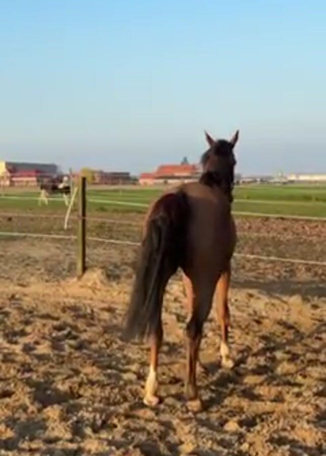 Here's a concise description of the video: The video features a chestnut-colored horse in a sand-covered paddock