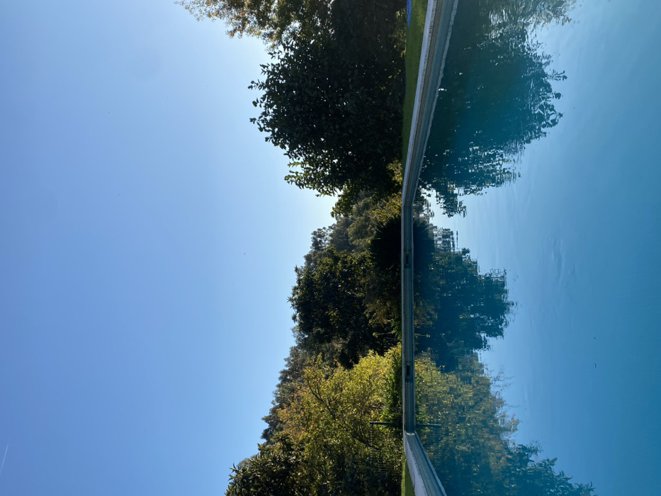The scene displays an outdoor, rectangular swimming pool located in Ponte de Lima, Portugal. The pool, filled with clear, light blue water, occupies the lower half of the frame and reflects the overhead clear blue sky and surrounding vegetation. A light-colored coping borders the pool. Behind the pool, a dense line of trees and shrubs forms a natural backdrop, with some foliage exhibiting yellowish-green tones on the left and darker green hues on the right. A narrow strip of green grass is visible along the pool's far edge to the right. The upper half of the image is a clear, bright blue sky. A faint white airplane contrail is present in the upper left sky quadrant, and several small, dark specks are sparsely distributed across the sky. No individuals or active subjects are visible within the scene.
