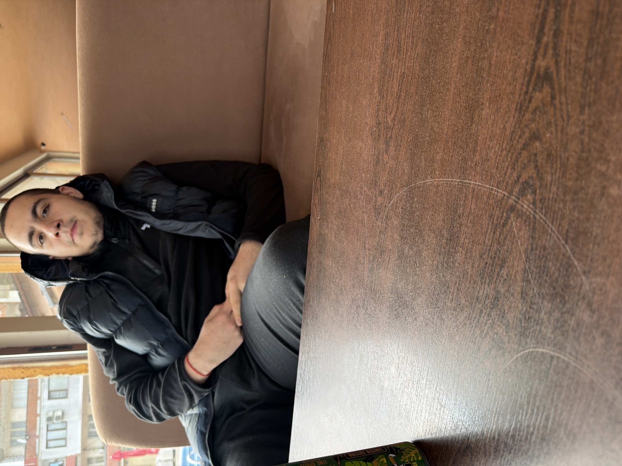 An indoor scene, presumably a cafe or restaurant in Rudozem, Bulgaria. One male individual, appearing to be a young adult, with short dark hair and light facial stubble, is seated on a brown upholstered booth. He wears a dark long-sleeved shirt beneath a black puffer vest with a "BOSS" logo visible on the left chest, and dark trousers. A thin red string is present on his left wrist. His hands are clasped or resting on his upper thighs, and he looks directly towards the camera with a neutral expression. In the foreground, a dark brown, wood-grain patterned table is visible, exhibiting circular marks and light scratches. A partial green beverage can, decorated with tropical foliage and a toucan, rests on the table in the bottom left corner. Behind the seated individual, a large window reveals an exterior urban environment. Visible through the window are parts of light-colored buildings, one featuring multiple windows and an air conditioning unit, and another with a red roof. The window frame appears worn. The interior wall above the booth is a plain light brown/tan, with a small, dark object, possibly a security camera or light fixture, mounted high on the wall in the upper right quadrant.