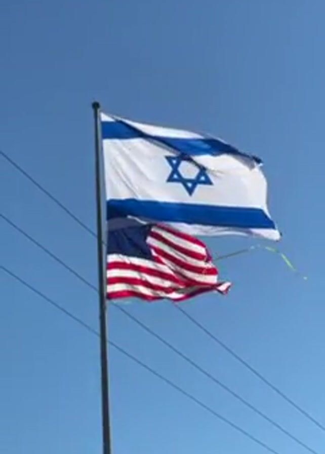 two flags attached to a single pole, waving in the wind against a clear blue sky. The top flag is the flag of Israel, which is white with two horizontal blue stripes and a blue Star of David in the center. Below it is the flag of the United States of America, with its red and white stripes and a blue canton with white stars. A few electrical wires are visible in the background. There is some man-made structure in the bottom left corner. The video is taken from a low angle, looking up at the flags.