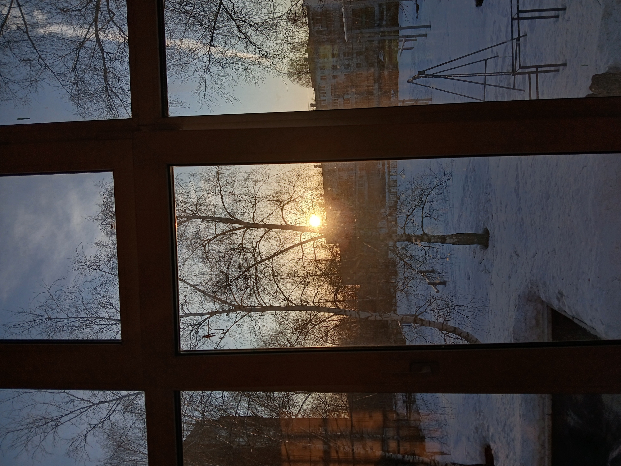 A view through a multi-pane window reveals a winter scene in Chaikovsky, Russia. The sun, low on the horizon, shines brightly through the bare branches of trees. A snow-covered ground stretches towards apartment buildings in the background. Playground equipment is visible in the snow. The window frame is made of dark wood. The reflection in some window panes shows distorted views of the same buildings and trees.