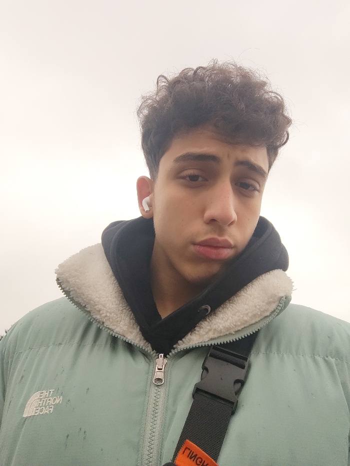 The image displays a headshot and upper torso of a young male individual against a uniformly light, indistinct background consistent with an overcast sky