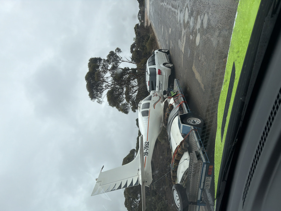 The image depicts an aircraft transport scene on a wet, paved road in Caiguna, Australia, under an overcast sky