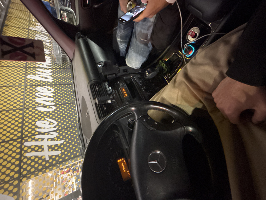 The scene is captured from inside the driver's seat of a parked Mercedes-Benz vehicle, indicated by the steering wheel emblem and dashboard